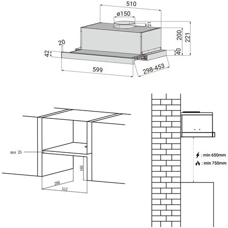 Integrated Telescopic Cooker Hood: Rocker Control, Extraction rate of 370m³/h, noise sound pressure of 64dB(A), 2 venting speeds. Class A Energy Efficiency, energy saving, and environmental friendly.