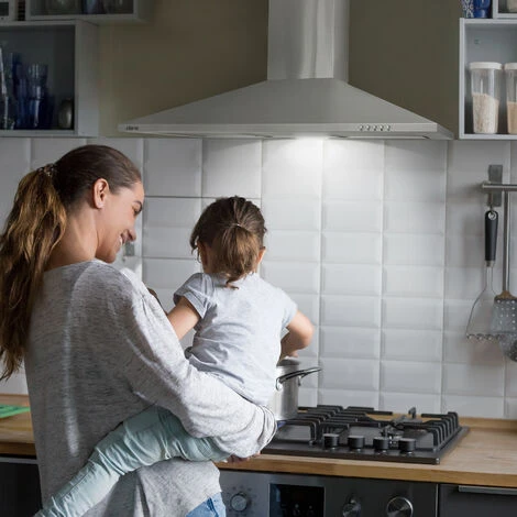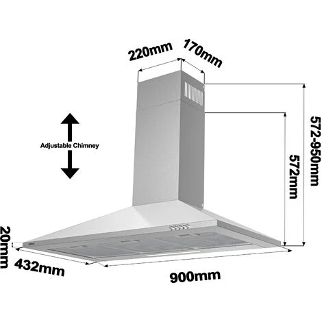 An elegant and efficient wall-mounted hood, with a 90cm width, this hood is perfect for a large kitchen or all modern and classic kitchen styles.