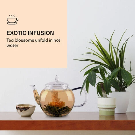 It’s tea time: The exotic tea roses from Feelino by Klarstein enchant not only with their seductive aromas. The tea is shaped into balls here, which unfold artistically after being infused with hot water. Each tea ball opens up and becomes a beautiful flower, which is colourful and large when viewed through the water. In addition to a full-bodied tea aroma, you also enjoy a special experience for the eye. A total of 6 different tea flowers of one flavour are included here, each showing a different flower beauty. Each tea flower is individually packed and vacuum-packed so that the full flavour is preserved for a long time. In addition, the exclusive tea goes a long way: one tea flower yields up to 2.5 litres of tea and you can use the blossoms for several infusions. Decoratively packaged, the tea flower set from Feelino by Klarstein is a special gift for many occasions.