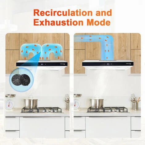 Depending on your possibilities, you can use the cooker bonnet in exhaust or recirculation mode. Recirculation cleans and removes odours with the help of activated charcoal filters. (2 carbon filters included)