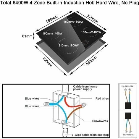 - 【Built-in Induction Hob】The induction hob 60cm adopts a built-in design, convenient for you to install and saves your kitchen space,making it easier to cook in a smaller space. Due to the high voltage, no electrical plug is included. Please install by qualified personnel according to our wiring instructions. Product Size: 59*52*6,1cm (W*D*H) Built-in Size : 56*49 cm.(Please confirm the size before buying)