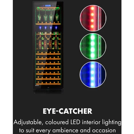 Visual aesthetics are also important for enjoyment: the lockable, tinted panoramic glass door with stainless steel frame ensures the skillful presentation of the wine stored inside. The switchable, coloured interior lighting also highlights the stored bottles to match the ambience. This makes the Klarstein First Class 129 wine dispenser a stylish visual highlight in bars or restaurants as well as for catered events or wine tastings.