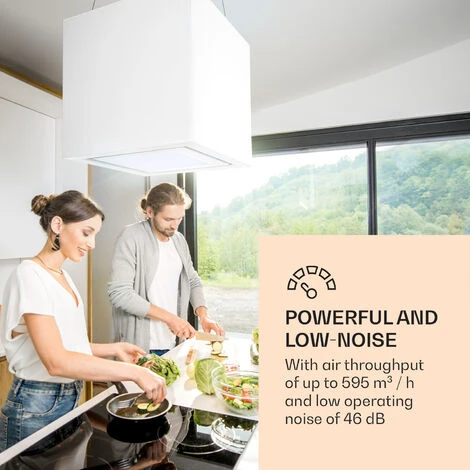 With the Kronleuchter Smart from Klarstein, the name says it all: the smart island extractor hood with an air flow rate of up to 595 m³ / h ensures clean and clear air in the kitchen. The integrated 6500 Kelvin LED panel lights up your cooking as bright as day. The hood can be controlled very conveniently via the Klarstein app. High-quality materials and the cubic design combine to create a real visual highlight. With three power levels, a low operating noise of 67 dB and energy efficiency class A, the Klarstein Kronleuchter Smart is truly impressive.