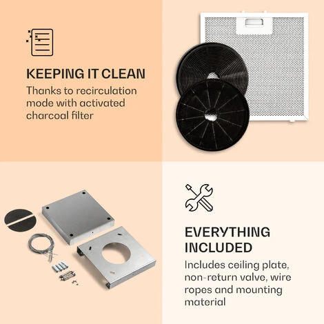 NO GREASE, OIL OR SMELLS: The kitchen extractor fan includes two aluminium grease filters to trap grease, oil and dust from the air, while activated charcoal carbon filters remove odours, smoke, and anything you don’t want to breathe.