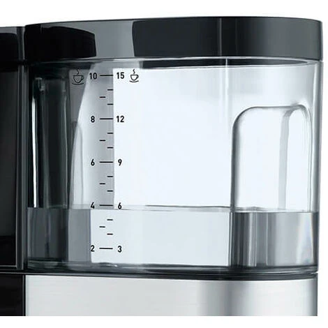 A detachable clear water tank is easy to fill and features clear cup markers for accurate filling.