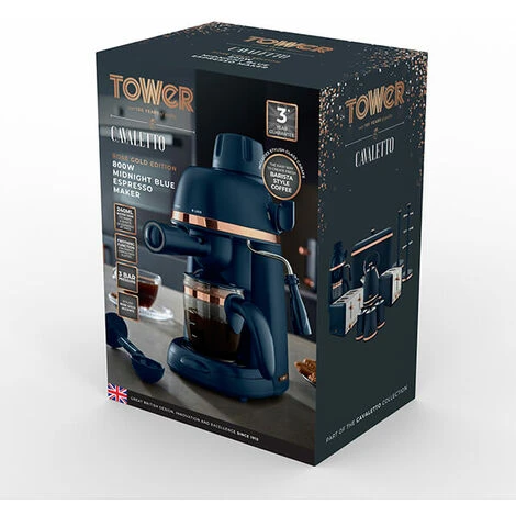 The Tower Cavaletto midnight blue espresso machine features a 3.5 bar pressure for producing a rich tasting barista quality coffee at home in just minutes.