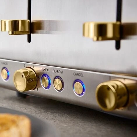 The 4 slice toaster has 6 browning levels and also features a defrost setting for bread straight from the freezer, plus a reheat setting in case your toast has gone cold or other baked items that need warming.