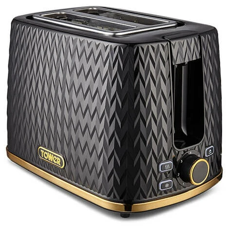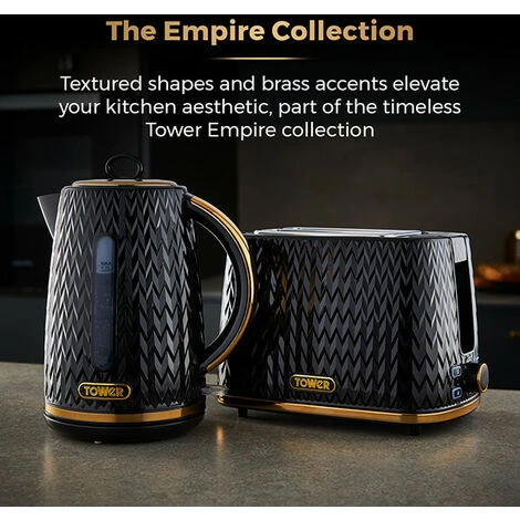 The Tower Empire 1.7 Litre Kettle and 2 Slice Toaster Set features a black geometric design with brass accents will add a touch of style to your kitchen.