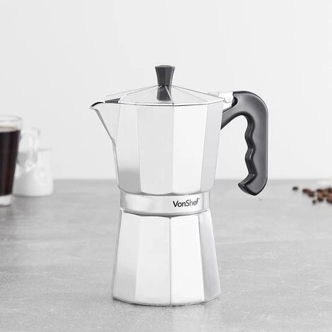 Master the art of authentic espresso coffee with this elegant 450ml stovetop espresso maker from VonShef. The ideal size for serving up 9 cups of espresso, this time-tested device produces a rich, highly concentrated coffee – perfect for kick-starting your day or as a mid-afternoon pick-me-up.